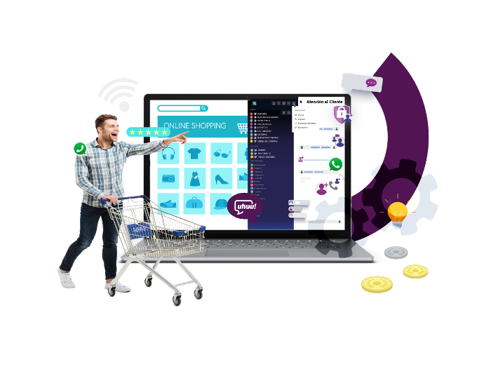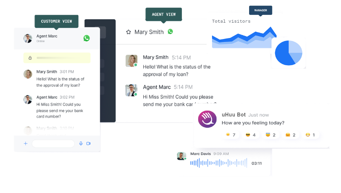 Uhuu!  Permite responder llamadas,  videollamadas, mensajes de texto, chats en directo y consultas externas como WhatsApp, Telegram y redes sociales desde un único centro en un entorno seguridad y privado.